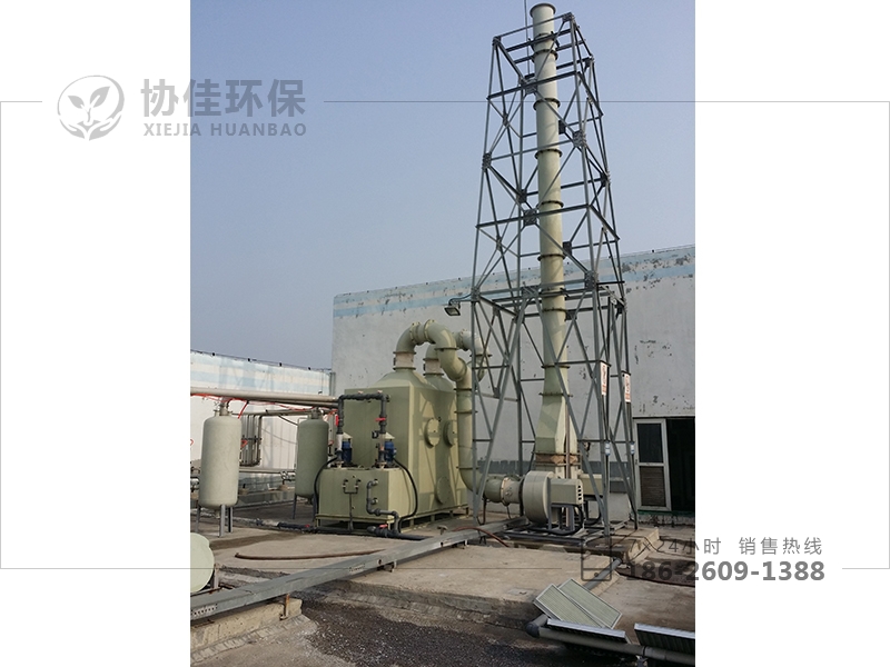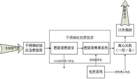 含有硅烷及氨氣等成分的混合廢氣通過管道進入不銹鋼硅烷燃燒塔中,在燃燒塔的燃燒室內硅烷氣體與通入的壓縮空氣接觸燃燒,燃燒后產生的二氧化硅粉塵從燃燒室底部的排渣口排出,而含有氨氣的其他廢氣進入噴淋洗滌室。在噴淋洗滌室中,氨氣與循環液發生反應而被處理掉,處理完的氣體經脫液室脫液處理后由抽風機抽出,最后通過排放煙囪排入大氣,排出氣體達到GB14554-93《惡臭污染排放標準》標準。當PECVD發生故障而出現應急排放時會排出大量的純硅烷,為了提高系統處理應急排放時的廢氣處理能力,本系統在燃燒塔前接一個不銹鋼硅烷應急燃燒筒。