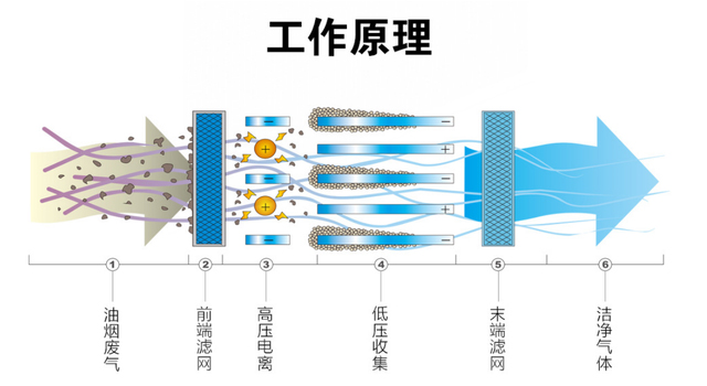 油煙由風機吸入油煙凈化器內,油煙中比較大的油污顆粒和油霧滴能在均流板上由于機械碰撞、阻流而被捕集到。當氣流進入高壓靜電場時,在高壓電場的作用下,油霧荷電、油煙氣體電離,絕大多數得以降解和炭化;一小部分微小的油粒在吸附電場的電場力及氣流的作用下向電場的正負兩極運動,并被收極到基板上。并在自身的重力的作用下流到集油盤上,并經過排油道排出去。剩下的微米級的油霧被電場降解成二氧化碳和水后排出潔凈的空氣;并且在高壓發生器的作用之下,電場內部的空氣產生臭氧,除去了煙氣當中的大部分的氣味。