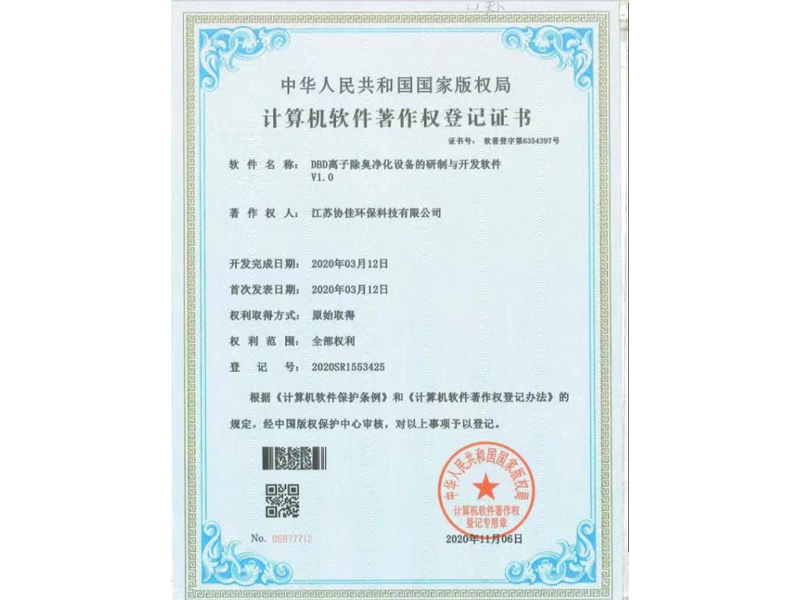 計算機軟件著作權登記證書-DBD離子除臭凈化設備的研制與開發軟件V1.0