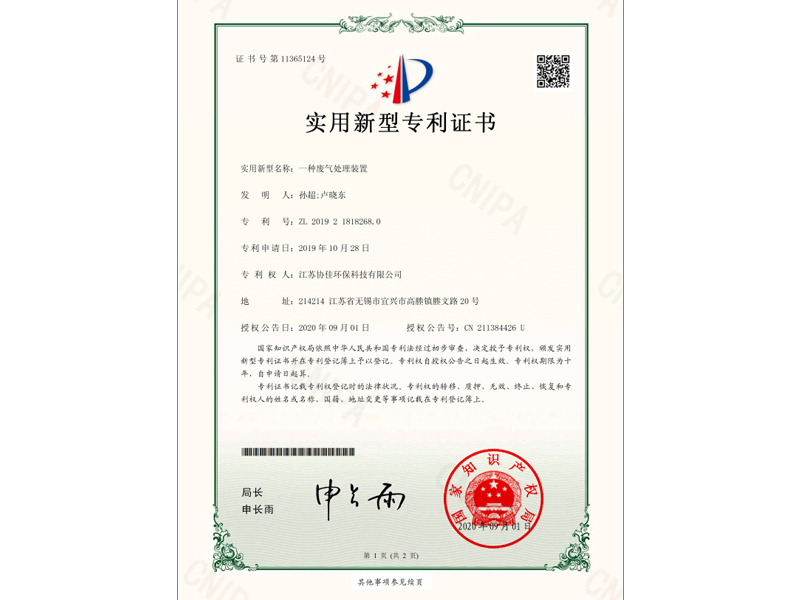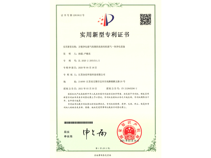 實用新型專利證書-方便凈化廢氣檢測的高效有機廢氣一體凈化設備
