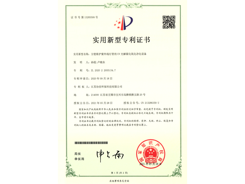 實用新型專利證書-方便維護紫外線燈管的UV光解催化氧化凈化設備