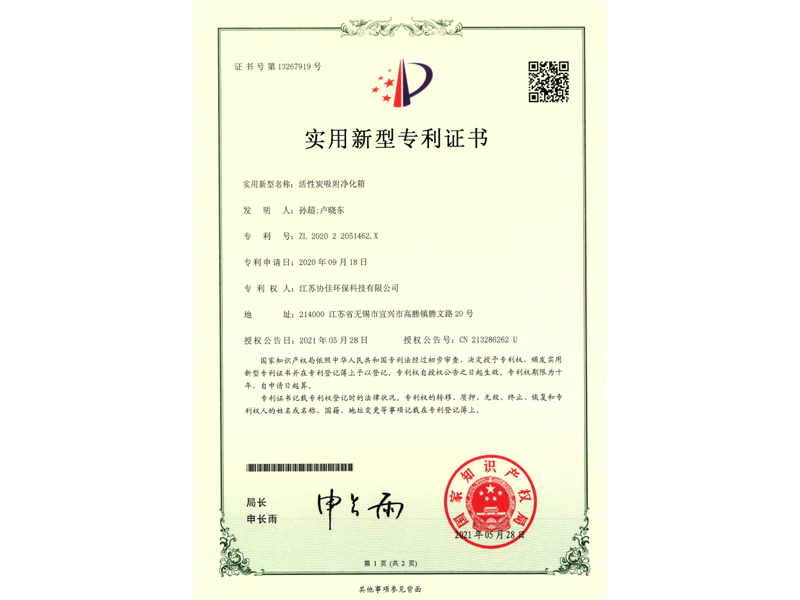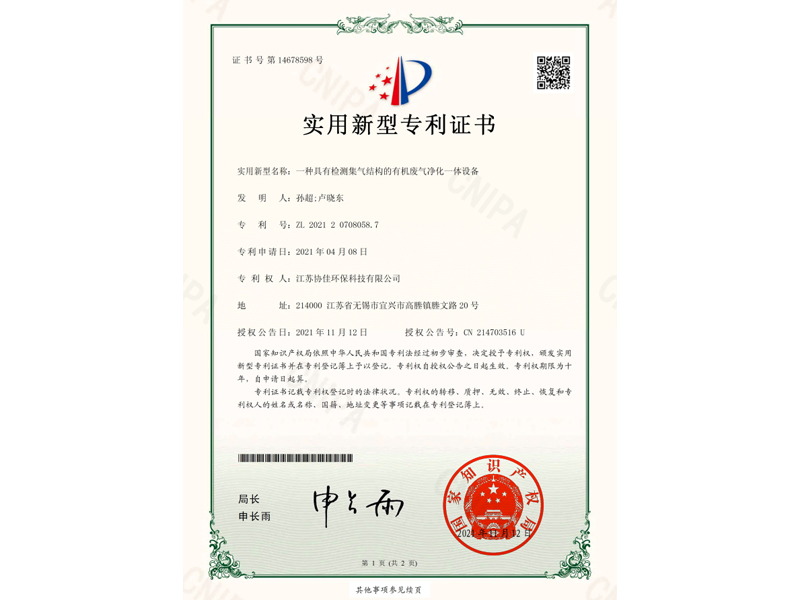實用新型專利證書-一種具有檢測集氣結構的有機廢氣凈化一體設備