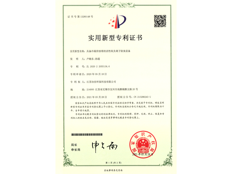 實用新型專利證書-具備冷凝排放塔的活性氧負離子除臭設備