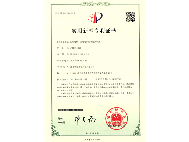 實用新型專利證書-內設連續S型通道的生物除臭裝置