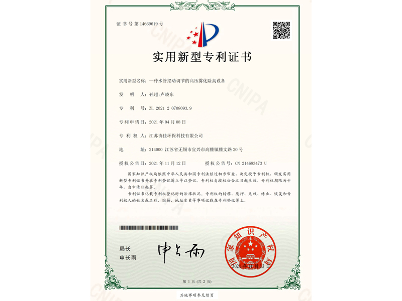 實用新型專利證書-一種水管擺動調節的高壓霧化除臭設備